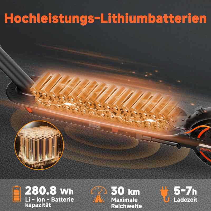 • 36-V-7,8-Ah-Lithium-Ionen-Akku, tatsächliche Reichweite von 30 km (getestet mit einem 70 kg schweren Fahrer im Stadtverkehr), ausreichend für den täglichen Arbeitsweg und Lieferfahrten