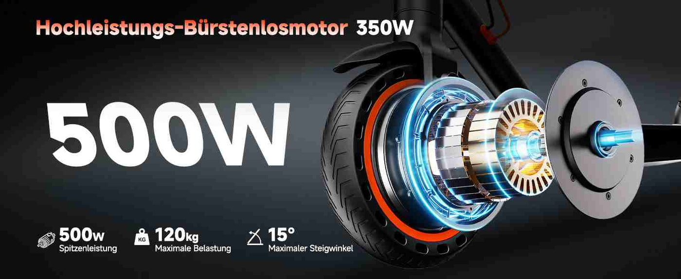 • 350-W-Gleichstrommotor (bürstenlos), Höchstgeschwindigkeit 20 km/h, Steigfähigkeit bis zu 15°, perfekt geeignet für den täglichen Arbeitsweg und verschiedene Straßenverhältnisse in der Stadt