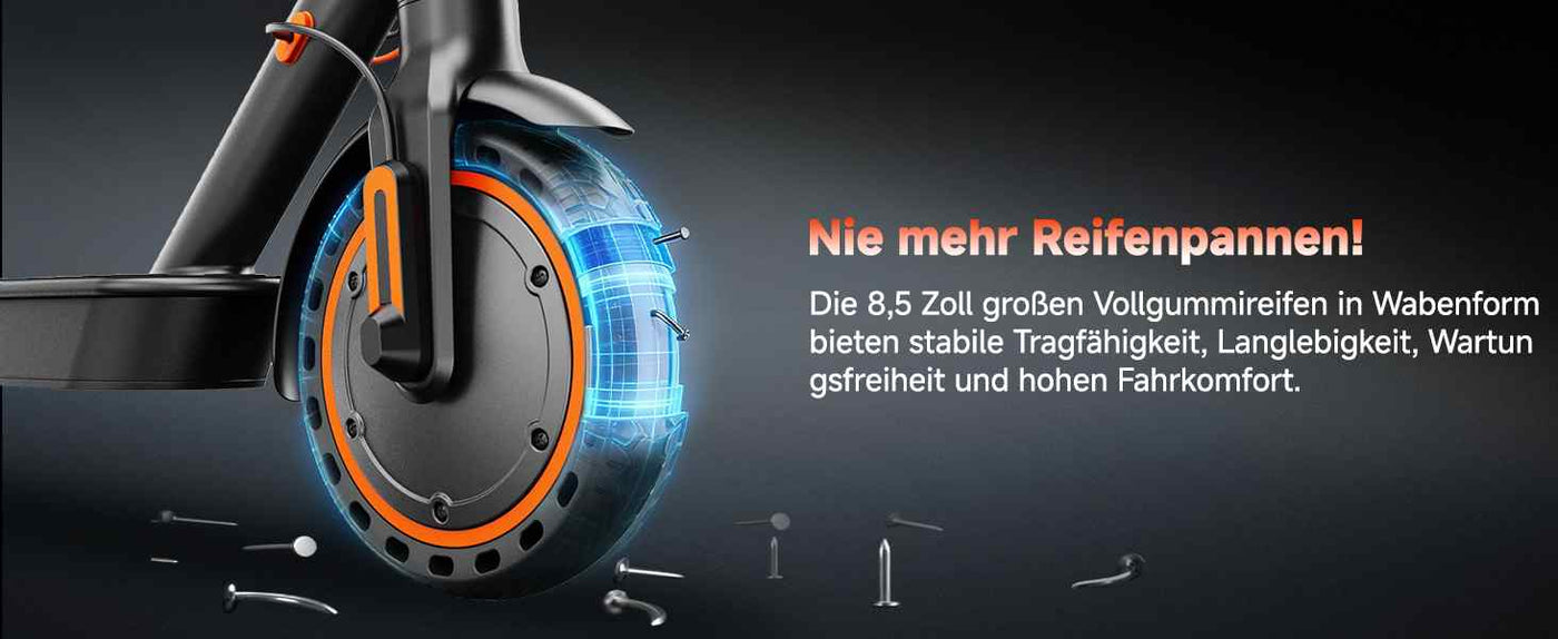 • 8,5-Zoll-Runflat-Reifen mit Wabenprofil, elektronisches E-ABS-Antiblockiersystem und Hinterrad-Scheibenbremse gewährleisten sicheres Bremsen auch auf rutschigem Untergrund.