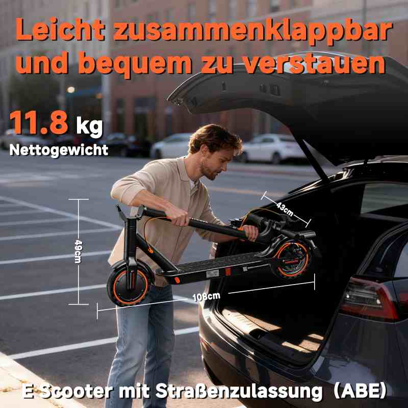 Dieser Elektroroller lässt sich mit einem einzigen Klick in nur 3 Sekunden zusammenklappen, wiegt lediglich 11,8 kg und ist bequem mit einer Hand zu tragen. Er nimmt im Kofferraum oder in der U-Bahn kaum Platz ein.