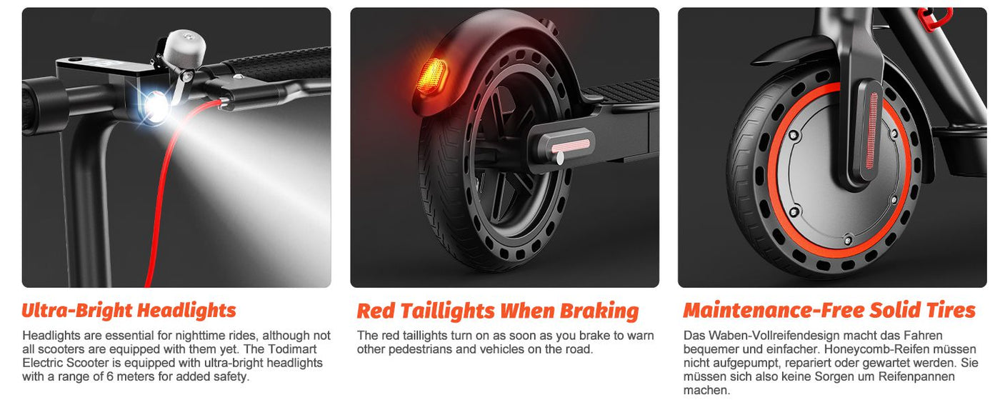 • 8,5-Zoll-Wabenprofil-Runflat-Reifen + elektronische E-ABS-Bremsen + Hinterrad-Scheibenbremse sorgen für sicheres Bremsen, selbst auf nassen oder rutschigen Oberflächen.