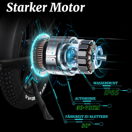 Dieses Elektrofahrrad verfügt über einen 250-W-Motor, der den europäischen Standards entspricht, und bietet eine tatsächliche Ausgangsleistung von bis zu 500 W. Damit erreicht es Höchstgeschwindigkeiten von 50 km/h. Das neueste Design mit Schrägverzahnung ermöglicht ein Drehmoment von 60-80 Nm.