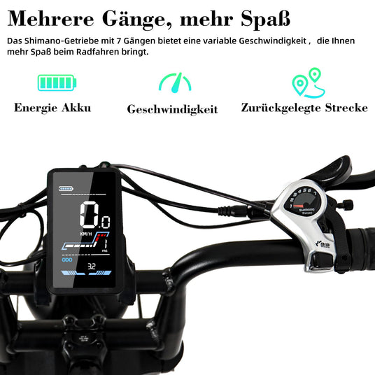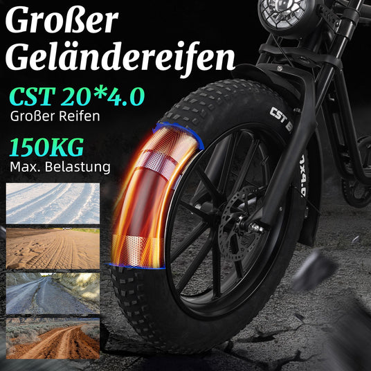 Begegnen Sie dem Winter voller Zuversicht auf Ihrem Elektrofahrrad mit 20 x 4 Zoll großen Fatreifen. Sie bieten hervorragenden Grip und Stabilität auf verschneiten und sandigen Oberflächen und gewährleisten eine ruhige und kontrollierte Fahrt in jedem Gelände.