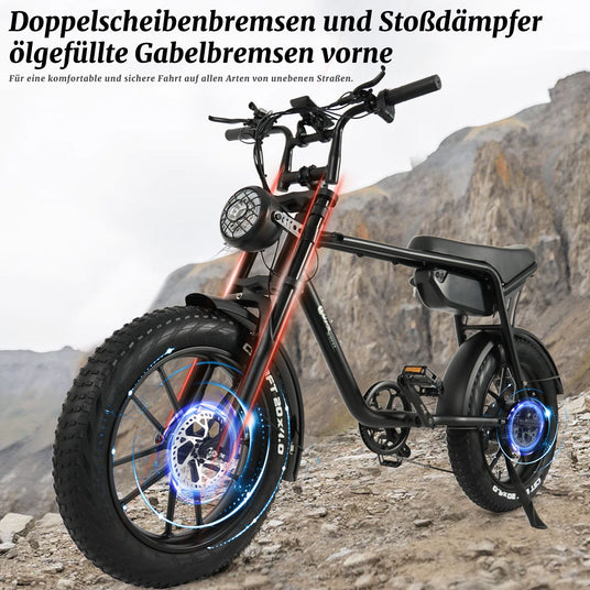 Mit doppelten hydraulischen Scheibenbremsen ausgestattete Elektrofahrräder bieten überlegene Bremskraft und Kontrolle und gewährleisten eine sichere und zuverlässige Bremsleistung unter allen Bedingungen. Diese doppelten hydraulischen Scheibenbremsen zeichnen sich durch eine hohe Übertragungseffizienz des Bremsdrehmoments aus und bieten schnelle Reaktion, Stabilität und Haltbarkeit – und das alles bei völliger Wartungsfreiheit.