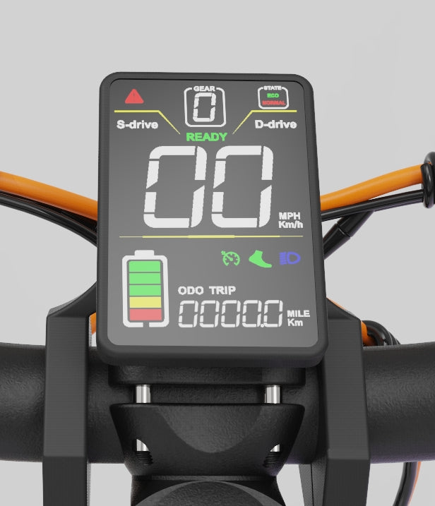 The adult electric scooters come with a smart LCD meter, which shows the instant speed, speed mode, battery life, lighting and etc. Featuring LED headlights and taillights with left and right steering indicators, the electric scooter is safe to ride even at night. The stoplight in the rear automatically turns on during braking for a smart and safe ride.