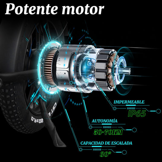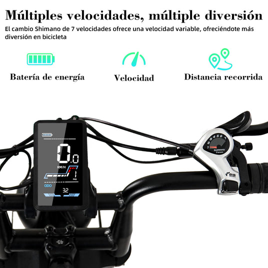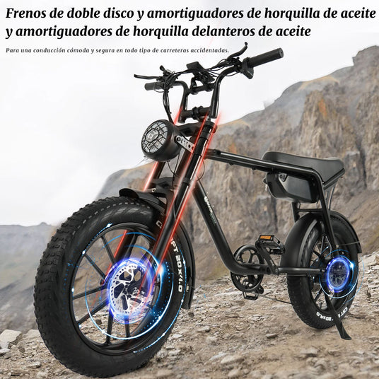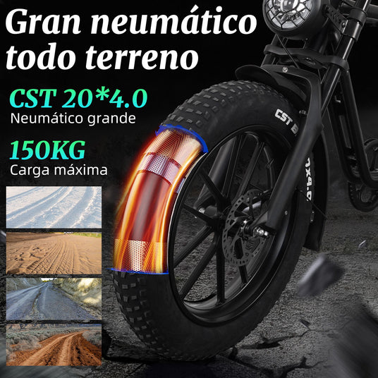 Acepta el invierno con confianza en tu bicicleta eléctrica con neumáticos anchos de 20*4”, que ofrece un agarre y una estabilidad superiores en superficies nevadas y arenosas, asegurando un andar suave y controlado en cualquier terreno.